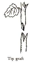 containing two or three eyes, showing green buds. Many growers wax the grafts to prevent drying out and to exclude moisture and disease organisms. Use grafting wax or grafting tar (Colgraft or Emastak). Using a small paint brush, paint the grafting wax over the entire graft, sealing it completely. You need not remove the wax, for it will break off as you remove the grafting tape. When using the grafting tar, completely seal the union of the scion and rootstock and the cut on the scion. Do not cover the buds or eyes! The success of the grafting operation is dependent upon acquiring a skill or `feel' in the procedure. It takes a certain amount of practice to get this feel and the more grafting you do the more proficient you become. You won't do it perfectly the first time, but each one you do after will get better. When pruning a bush save a long branch to practice on, making one slanting cut after another until you can make even, regular cuts that will match perfectly on the sides (without cutting your fingers). Get the best knife you can find made of good quality steel which will hold an edge; there are special grafting knives by various manufacturers including. Kunde which are designed for the job. Keep it clean and sharp and protect its edge from contact with other tools. Do not use it for any other purpose except cutting plant material, and apply a thin coat of oil or vaseline to the blade when not in use for any length of time. Learn how to hone a fine edge with a good fine grain carborundum stone and how to whet a razor edge. Grafting knives are sharpened on one side only, either for left or right-handed people. Lay the blade almost flat on the stone and sharpen against the edge as though you were cutting the stone, moving the blade toward you at an angle of about 30°. Some people prefer to move the blade in a circular motion on the stone. Be careful to keep the surface of the stone perfectly smooth and even. Remove any burs by stropping on leather or very fine emery paper. Plant fibres and acids in the tissues slowly erode and corrode the fine knife edge, so it should be stropped now and again. If you keep a raw potato handy and run the knife edge through it occasionally the potato will clean the knife and help it stay sharp longer. The knife should be able to slice through the stringy fibres of the wood at a small angle without bruising or tearing. It is important that the knife edge is keen enough to make smooth cuts that match perfectly with an even contact between surfaces. The popular utility knives with interchangeable blades may be used as long as the user takes care, for they are very sharp. They are also cumbersome, but with practice one becomes just as proficient with them as with the normal knives. The changing of blades takes but a second and one is always assured of a very sharp edge. Stick to a well known brand such as Stanley, for the blades of some brands are of inferior steel with poor cutting edges. Always try to match the thickness of the scion with an