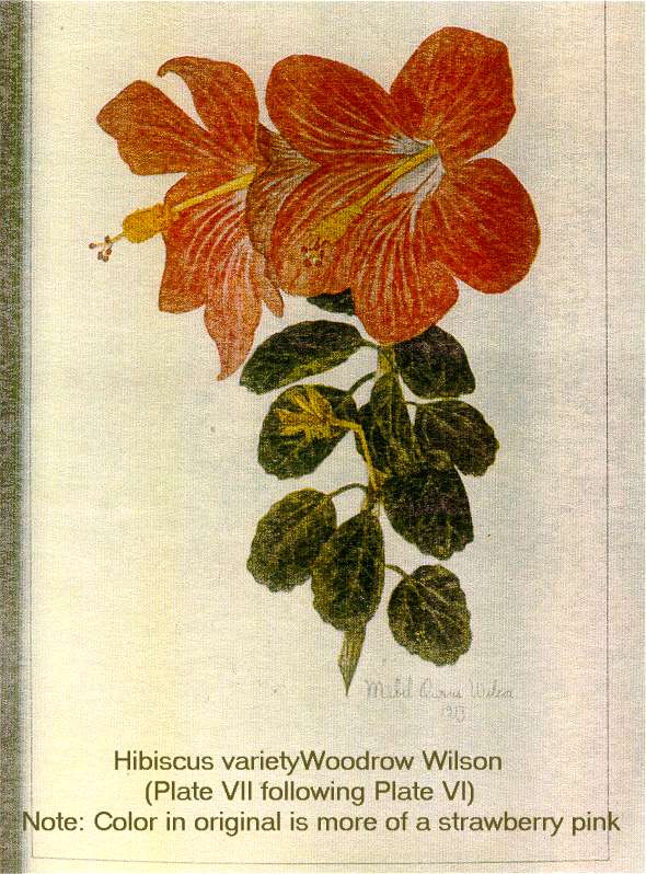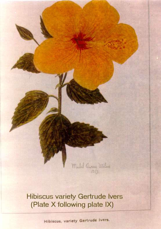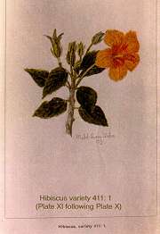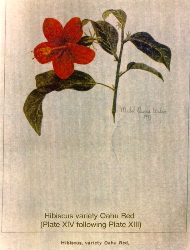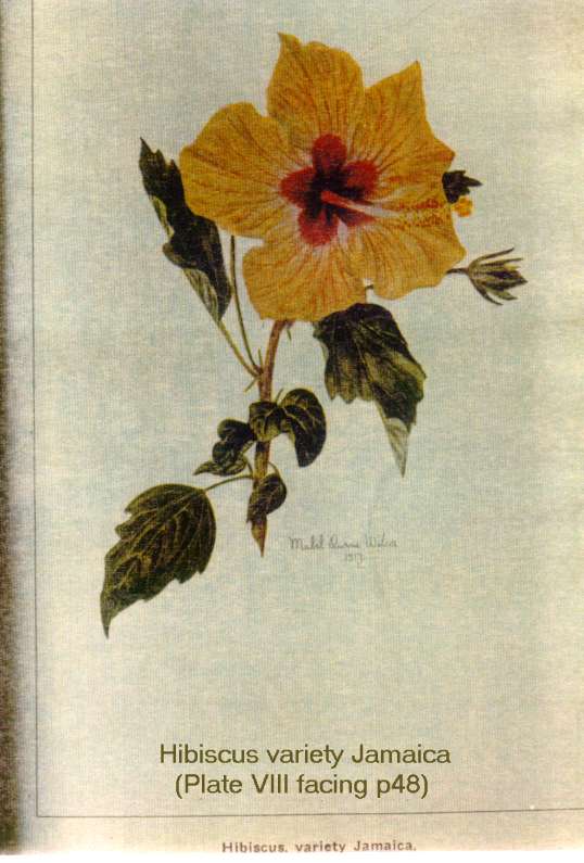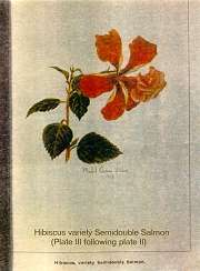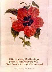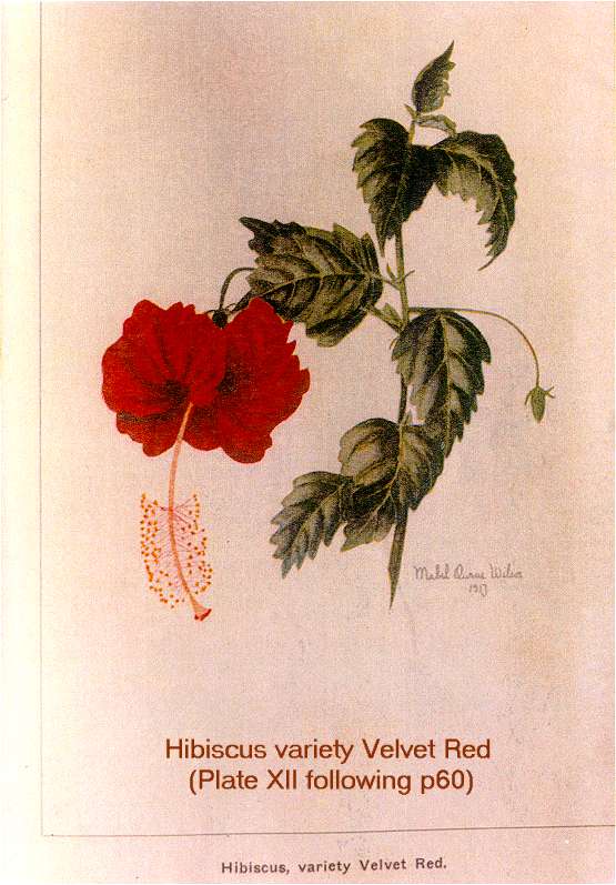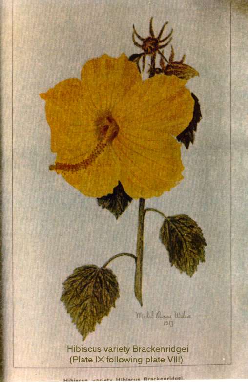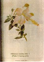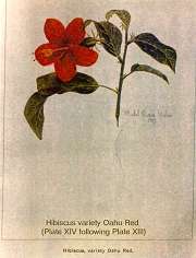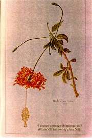 Jill Coryell of Hawaii sent us this information and says: " The enclosed 'Bulletin 29' is being sent with the kind permission of David Orr, Acting Director of the Waimea Arboretum. He asked me to make sure I gave credit to our previous Director, Mr Keith Woolliams, under whose direction Waimea collected the vast amount of living hibiscus plus an extensive library of reference to hibiscus." "The 'Manual of the Flowering Plants of Hawaii' is our current "Bible" here and I'm sending the Malvaceae pages - printing permission will be needed from Bishop Museum." The Bishop Museum of Hawaii has given us permission to offer the botanical information from their excellent two volume publication (Second Edition has since been published in 1999) from the section Malvaceae which includes Hibiscus native and introduced to Hawaii. Although technical in nature, some readers will find the material challenging. Follow the Bishop Museum link above, click the "Bishop Museum Shop on-line" link, click "catalog" on the left, then "Books" and scroll down to get the details of the 2-volume encyclopaedia - Manual of the Flowering Plants of Hawai'I: Revised Edition. Warren L. Wagner, Derral R. Herbst, S.H. Sohmer - US$95. You may also find many others of their shop products of interest. Our thanks to Jeff Bell for the reproduction permission. See our slightly incomplete extract in three pages: Part1 - Part2 - Part3 Below see the historical hand-painted pictures from the original document, scans of scans of the originals but nevertheless of considerable importance to botanists and hibiscus historians in general. |