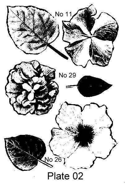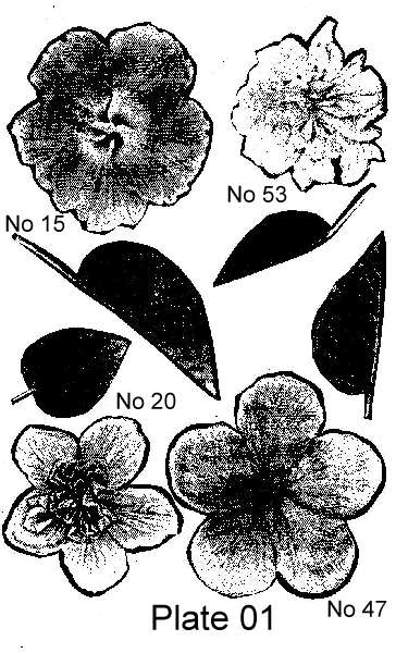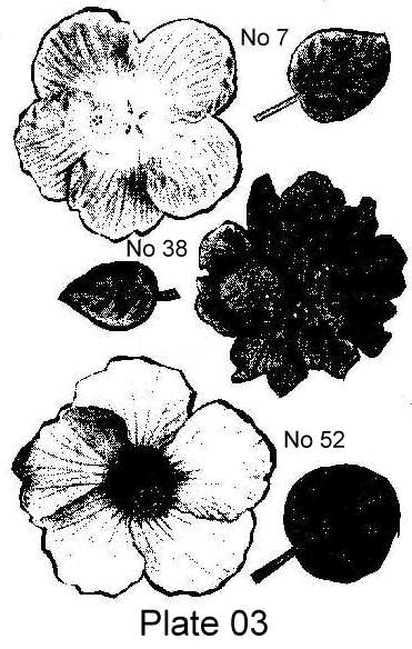No. 3. Albus - Peradeniya origin, single, ivory white to pale yellow. (Ridgway V. 25. f; sulphur yellow, with carmine centre.) A rather delicate shrub of somewhat slower growth than most others, slender habit, flowering very freely. A very delicate shade of colour. Propagated by cuttings. Flowers 5 inches in diameter.