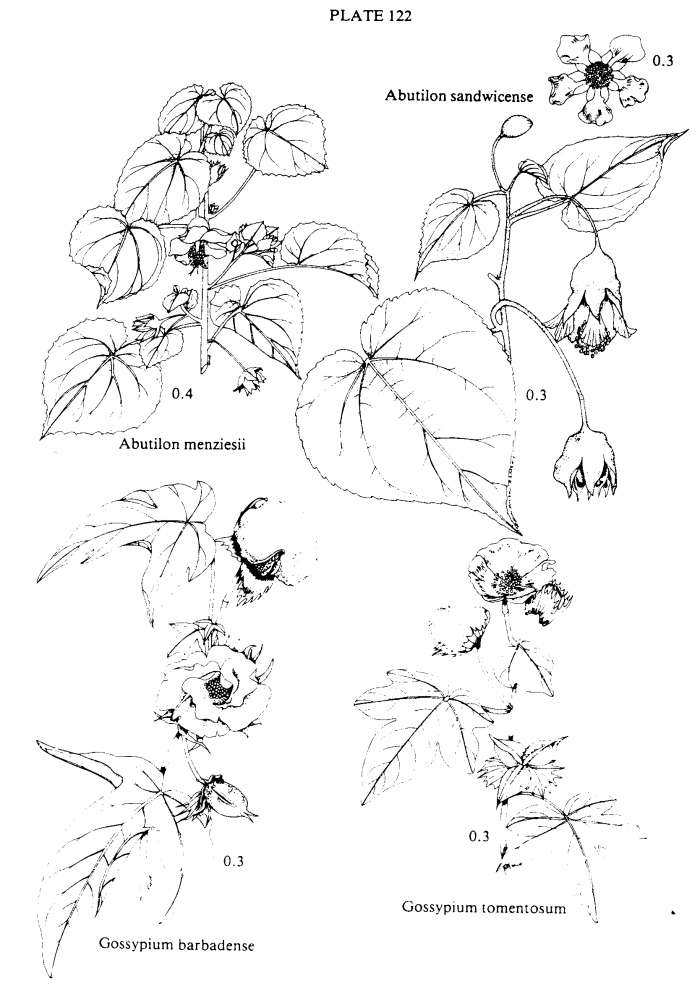 Shrubs 0.5-1.5 m tall, softly white tomentose. Leaf blades wider than long, usually 3-10(-12) cm wide, 3-lobed or sometimes 5-lobed to about the middle, the lobes ovate, acute or subacuminate, midvein on lower surface with basal gland absent or obscure, stipules subulate, 0.5-0.8 cm long, caducous. Flowers solitary or few in short cymes, pedicel nectaries absent; involucral bracts ovate, 15-25 mm long, dentate, with 5-9(-12) acute teeth; calyx erosely truncate, 7-9 mm long; petals bright yellow, without a maroon spot, fading greenish, 2-3.5(-4) cm long. Capsules 3-celled, coriaceous to woody, ovoid, cuspidate, 1.2-1.8 cm long, black-pitted. Seeds 2-4 per cell, ca. 5 mm long, densely covered with reddish brown lint. [2n = 52*.] Occurring primarily in arid, rocky, or clay coastal plains, 0-120 m, on all of the main islands except Hawai'i. - Plate 122. Gossypium tomentosum is one of the tetraploid cottons and presumably was derived from a Neotropical ancestor. 4. HERISSANTIA Medik (first part missing for now . ) HIBISCADELPHUS Page 877 of the Manualcorolla white or yellow, campanulate to rotate; staminal column shorter than petals, terminated by filaments; carpels 8-14, ovules 1-3 per carpel; style branches as many as carpels; stigmas terminal, capitate. Fruit a pendulous, inflated, oblate schizocarp, mericarps reniform, without awns, scarious, each dehiscing into distinct valves or the valves remaining joined basally, adjacent valves sometimes coherent.black, Seeds brown or ovoid-reniform, glabrate to puberulent.A weedy and widely distributed genus of 5 species of the New World tropics and subtropics. Named in honor of Louis Antoine Prospere Herissant, 18th century French physician, naturalist, and poet.