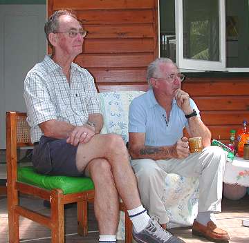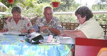 | Norm Hatton and Brian Fischle concentrate on proceedings. | Brenda Dennis, our newest member, shows Phil and Mavis Barry's Dragon's Breath she awarded as Most Spectacular for the day. |