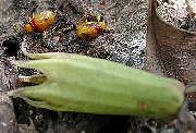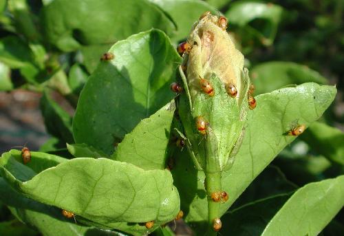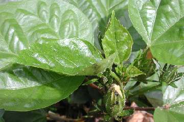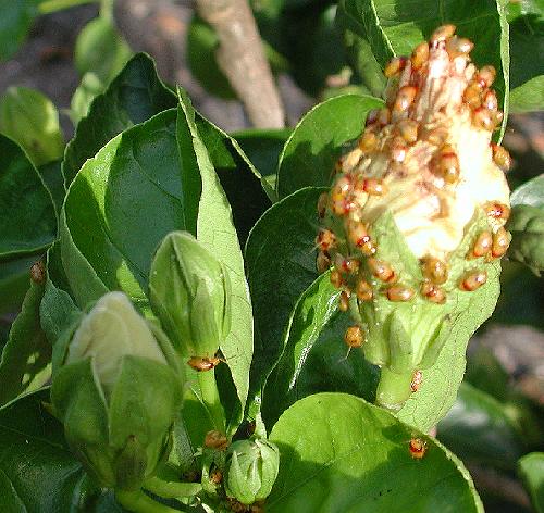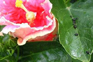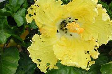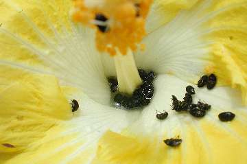 Management Aphids - Two-spotted Mite - Black Beetle - Monolepta Beetle (at bottom) I tend to spray as seldom as possible. Because we have twenty gardens of just hibiscus, a mono-culture, a patch of beasties soon spreads far and wide. We had a severe infestation of "Red Spider" or two-spotted mite particularly in the garden near the kitchen windows where the light seemed to attract them to that area. Of course, that black beetle, starved for pollen, invaded every bud two days early, burrowing in for first chomp! Suddenly - maybe over a week or two - we also had a massive invasion of aphids! I didn't photograph the infestation but the picture taken a day later shows how they shrivelled up! I saw that Avid (chemical: abamectin) was the recommended mite spray killing all stages - egg, nymph and adult - I've used it with excellent results in the past - this time full strength of 50mL to my 100L tank (a teaspoon to a 2-gallon bucket) and it is compatible with most other insecticides and fungicides. The effect is unsightly as all the affected leaves fall off and the new ones grow after spraying, but the resulting clean plant is worth waiting for. I read that Confidor (chemical: imidacloprid) was registered for aphids and beetle. Now Confidor has an oil base and I was advised by a horticulturalist to use oil as a spreader for the Avid for the best effect. Anyway, it was time to use Confidor at the 25mL to 100L higher strength. (Just a half a teaspoon to a 2-gallon bucket - get a graduated eye-dropper for 2.5mL to the bucket) I decided to make sure of the oil factor. My home-made white oil goes like this. Put 250mL Canola oil with 150mL of Sunlight or some other concentrated washing up detergent in a 1.2 litre soft-drink bottle - shake madly to aerate - and gradually fill it with water re-shaking to keep the emulsifying aeration working - it won't quite fill because of the suds!!! I then use 250 mL of this mixture in my tank - in effect just under 100mL of Canola mixture per 100L. Remember, hibiscus lose leaves if too much oil is used. 1 part to 200 is the recommended strength early or late in the day. My mix of 1:1000 seems enough as a wetter/sticker as the chemicals do the job. A stronger mix could be made, but this works for me. My day this time was very overcast but I was finished spraying each day by 9 am. The brew worked wonders. I look forward to some flowers in a few days. Sadly, the 400L is about AU$100 - the reason I usually hold off spraying till nearer show time. |