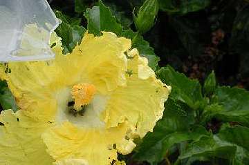 To the left, a poor Kinchen's Yellow has weathered two days of bombardment and a little spray (below, left) is poured from a jug into the bloom. One hour later, the effect (below) can be seen. | ||||